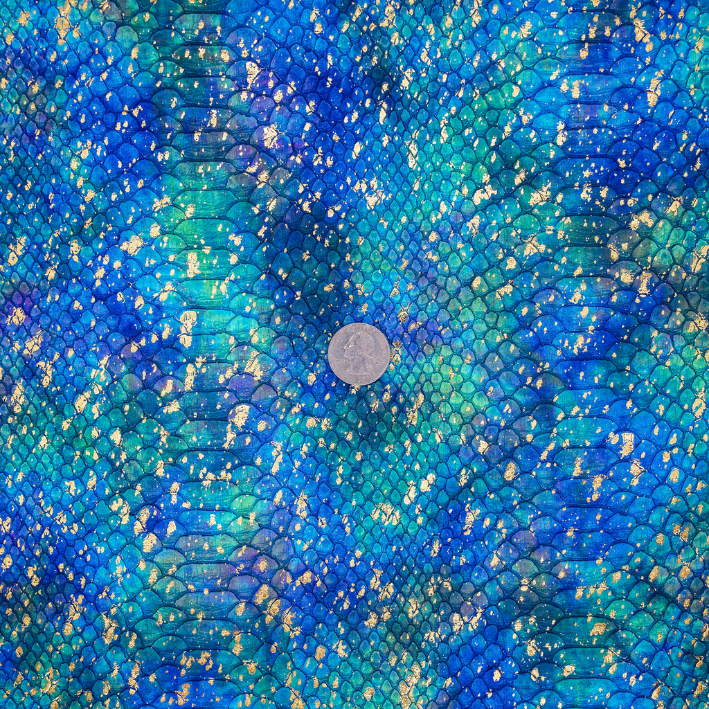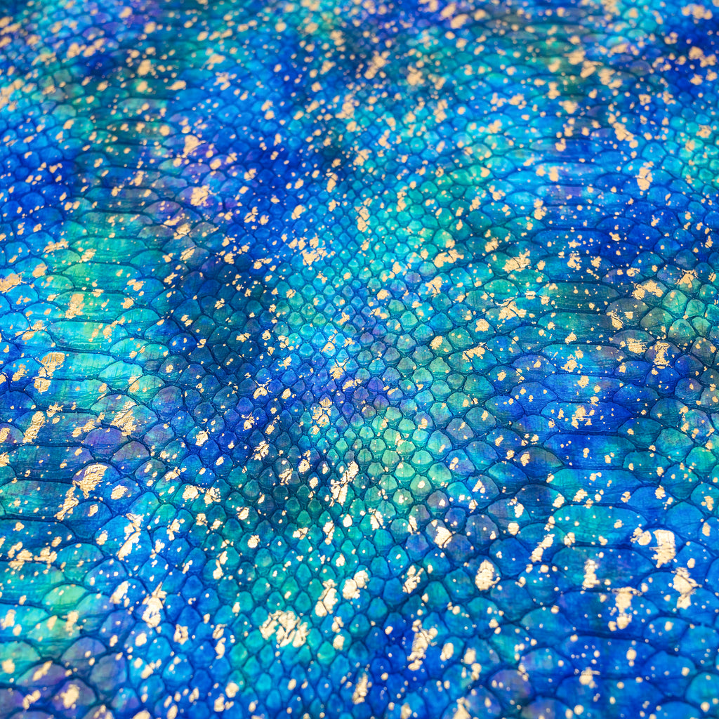 Make your next bag stand out with MerGlo™ Mermaid Embossed Vinyl, a scale-textured vinyl designed for bag making, wallets, and accessories. Iridescent teal and deep ocean blues are kissed with gold flecks for a luxe, mermaid-inspired finish. The surface is durable and wipes clean. Each roll is pre-cut to 18" × 52" (± 1″) for dependable, project-ready results.