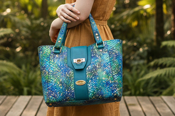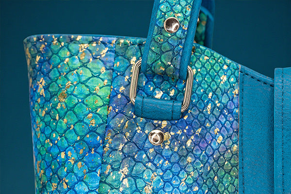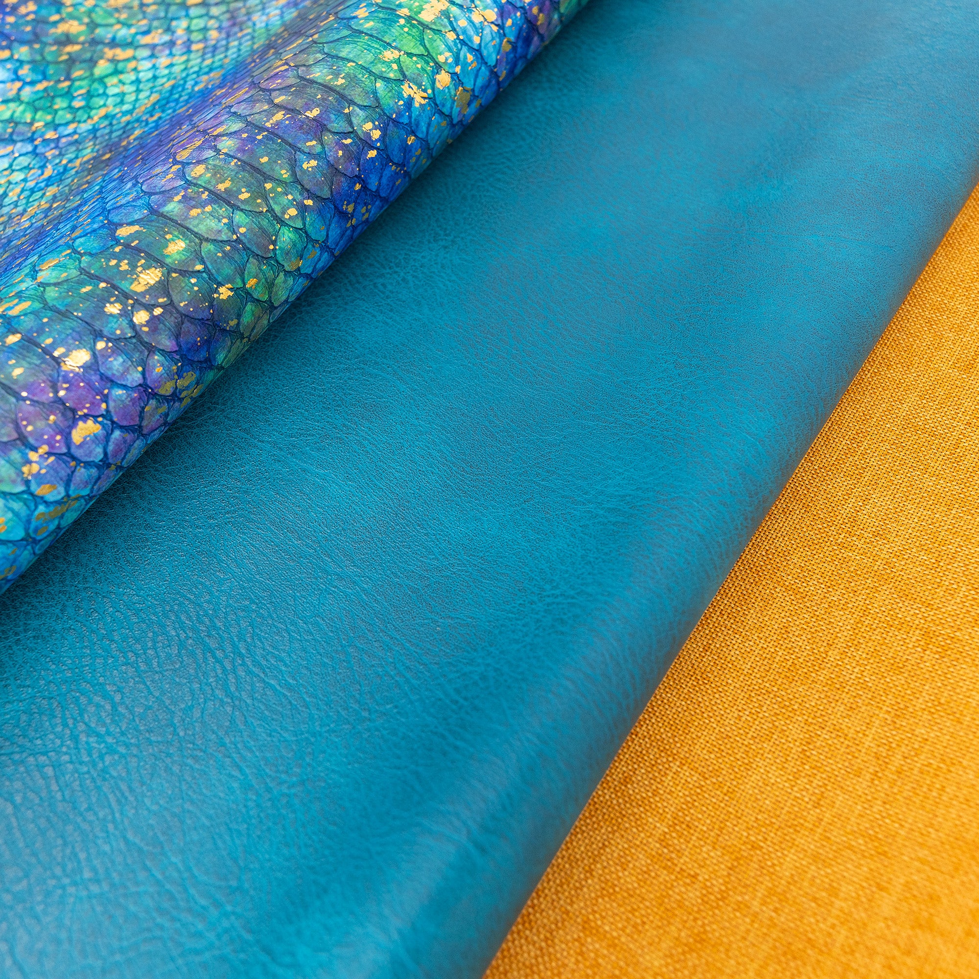 Mermaid Fabric Bundle for bag making blends luminous texture with rich coastal color for a bold, eye-catching finish. This curated bundle pairs shimmering MerGlo™ mermaid vinyl with deep teal faux leather and a warm gold waterproof canvas lining, creating a striking combination perfect for statement handbags, totes, and accessories.