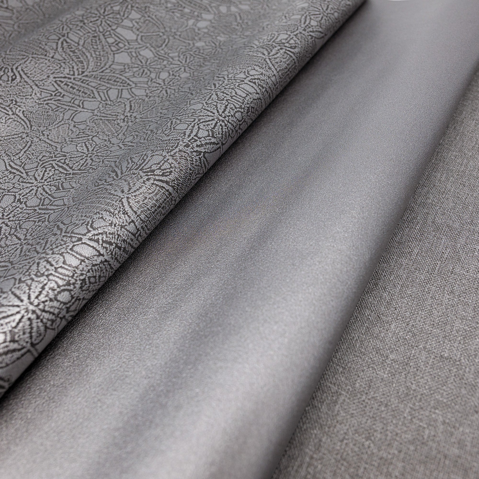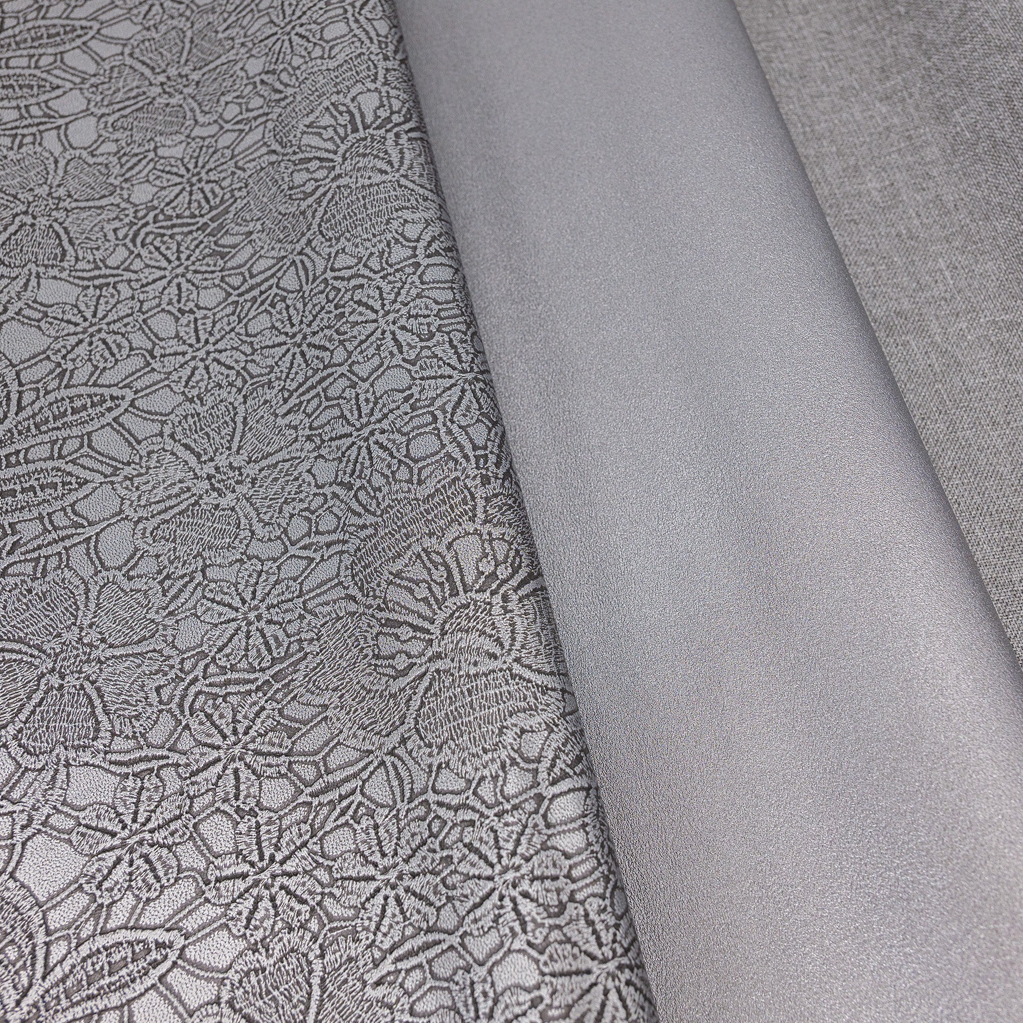 Metallic Floral Embossed Fabric Bundle for bag making combines subtle texture and soft metallic sheen for a clean, modern finish. This curated bundle pairs a charcoal floral embossed vinyl with sleek steel metallic vinyl and a neutral waterproof canvas lining, making it ideal for handbags, totes, and accessories that feel refined, durable, and timeless.