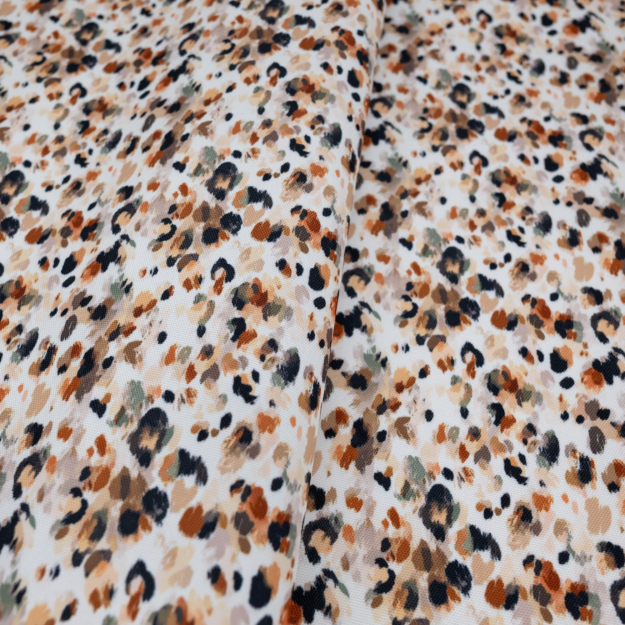 Soft, artistic, and effortlessly stylish, Painterly Leopard Water-Resistant Canvas features a modern animal print with hand-painted brushstroke texture in warm tan, caramel, sage, charcoal, and black tones on a creamy background. The layered, organic spots give this leopard design a refined, wearable look that works beautifully for handbags, totes, and everyday accessories. Made from 600 denier PU-coated polyester, this fabric offers light structure and moisture resistance with no interfacing needed for most bag projects.
