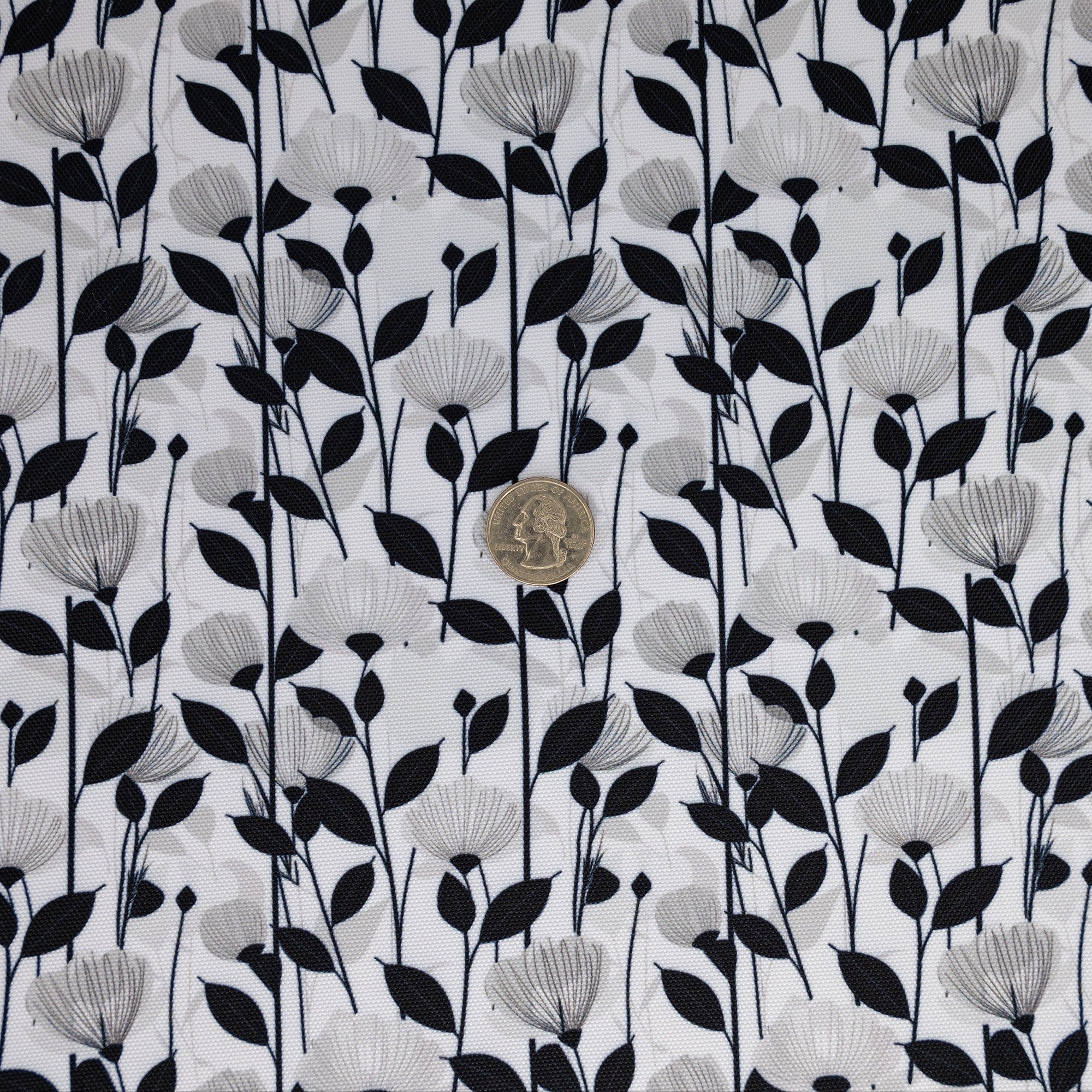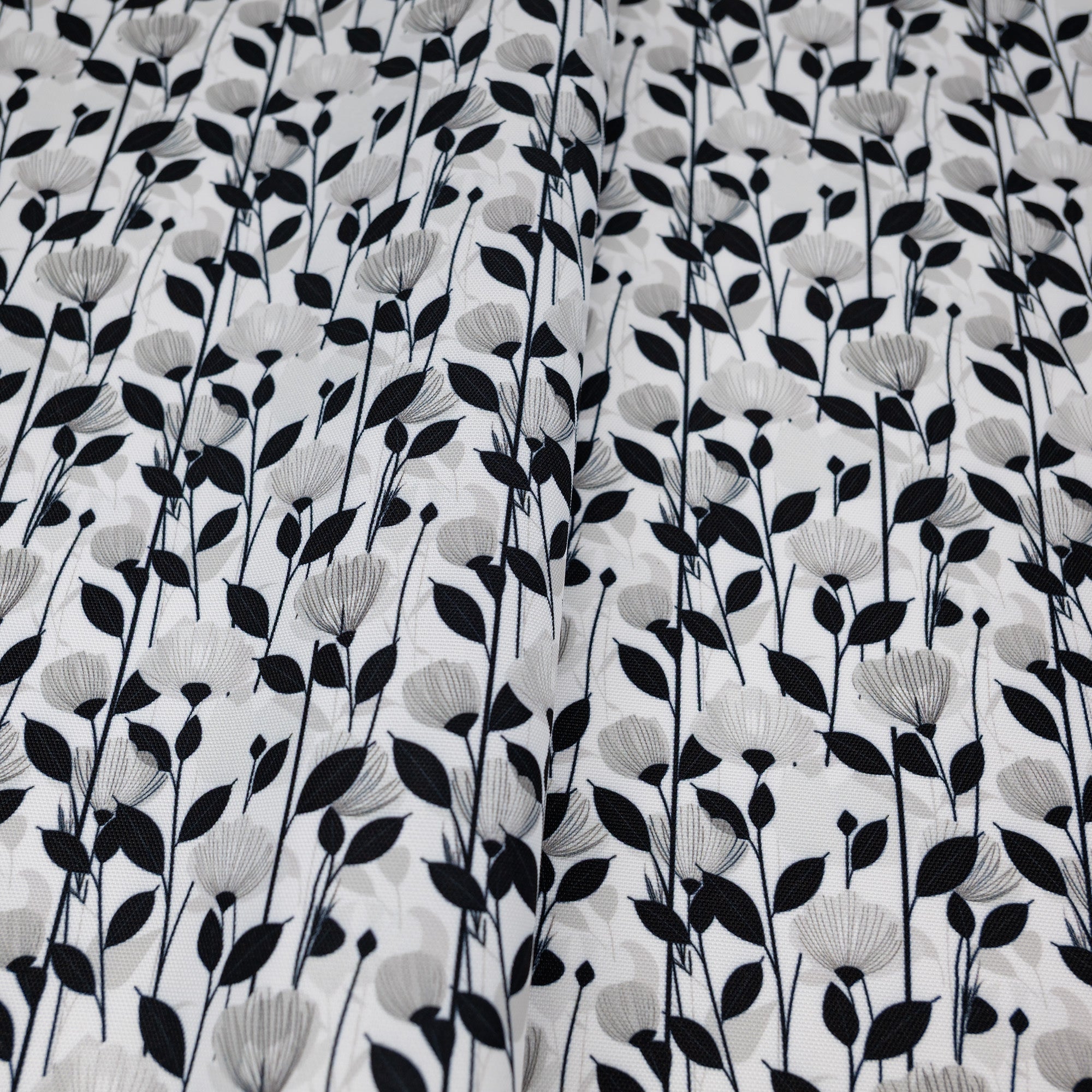 Striking and modern, Shadow Blooms Water-Resistant Canvas features bold black botanical silhouettes layered over soft gray florals for a dramatic, high-contrast look. The tall stems and flowing petals create visual movement while keeping the design clean and sophisticated. Made from 600 denier PU-coated polyester, this fabric offers light structure and moisture resistance with no interfacing needed for most bag projects.