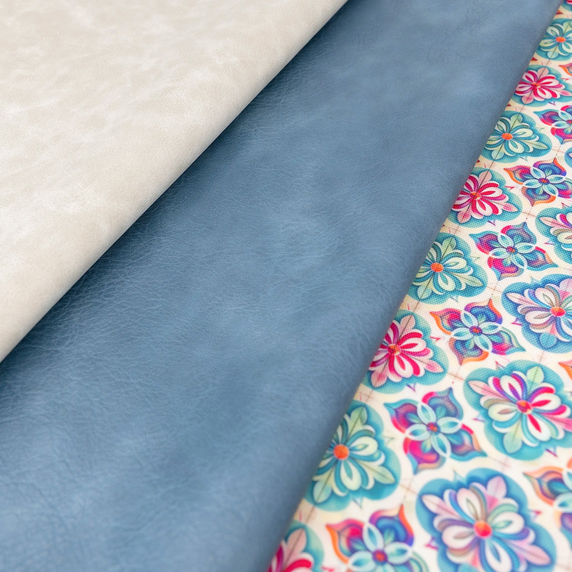 Summer Mosaic Fabric Bundle for bag making pairs cool, modern color with soft texture for a fresh yet grounded finish. This curated bundle features steel blue faux leather as the main exterior fabric, beige suede for subtle contrast, and a water-resistant mosaic canvas for linings and pockets. It’s designed for handbags, totes, and everyday accessories that feel light, balanced, and intentionally coordinated.