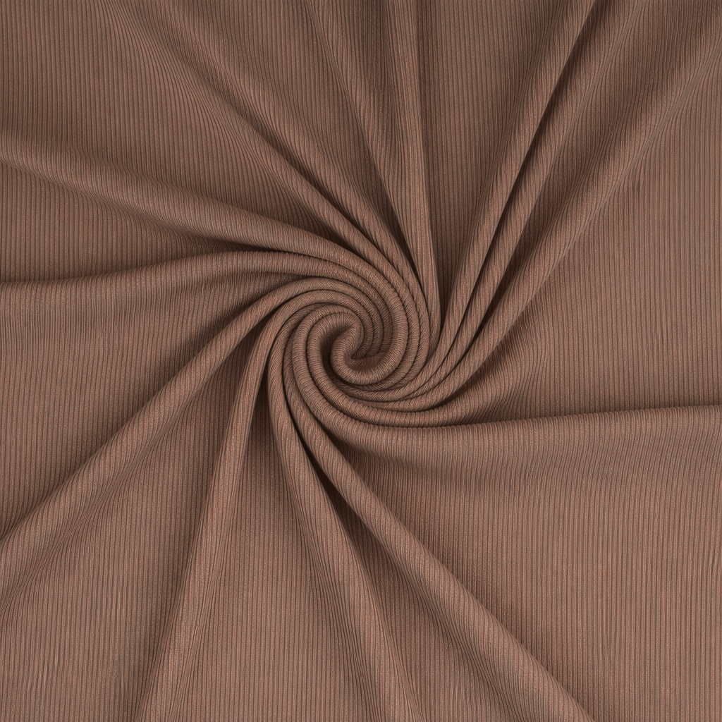Taupe rib knit fabric made with 92% viscose fiber and 8% spandex for a soft, stretchy feel with great comfort and recovery. With a 260gsm weight and a wide 71" width, this rib knit is substantial without feeling bulky, making it ideal for fitted garments that still move with you. It sews well on a domestic machine using a zigzag or stretch stitch, or on a serger. For the cleanest hems, a twin needle or coverstitch works beautifully.