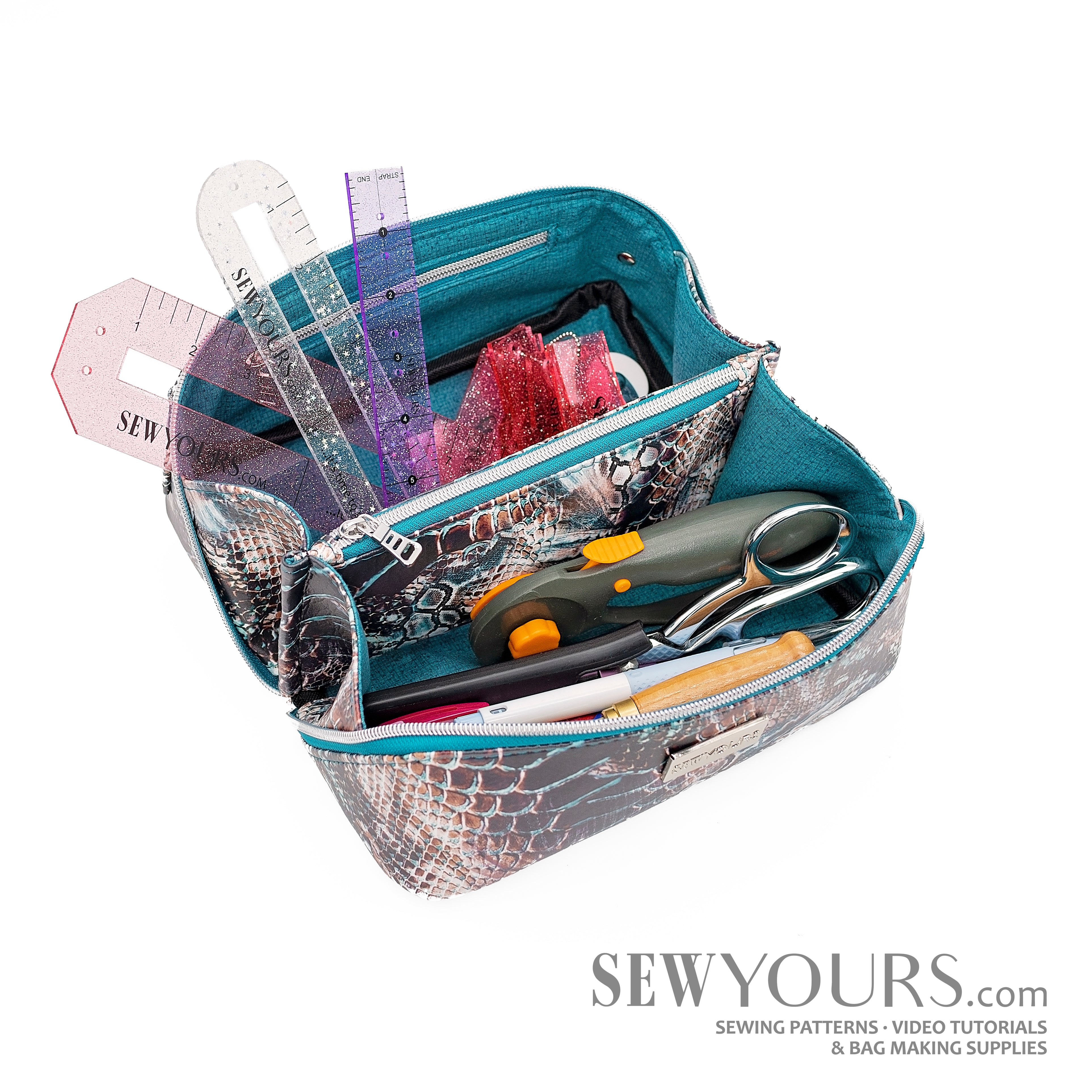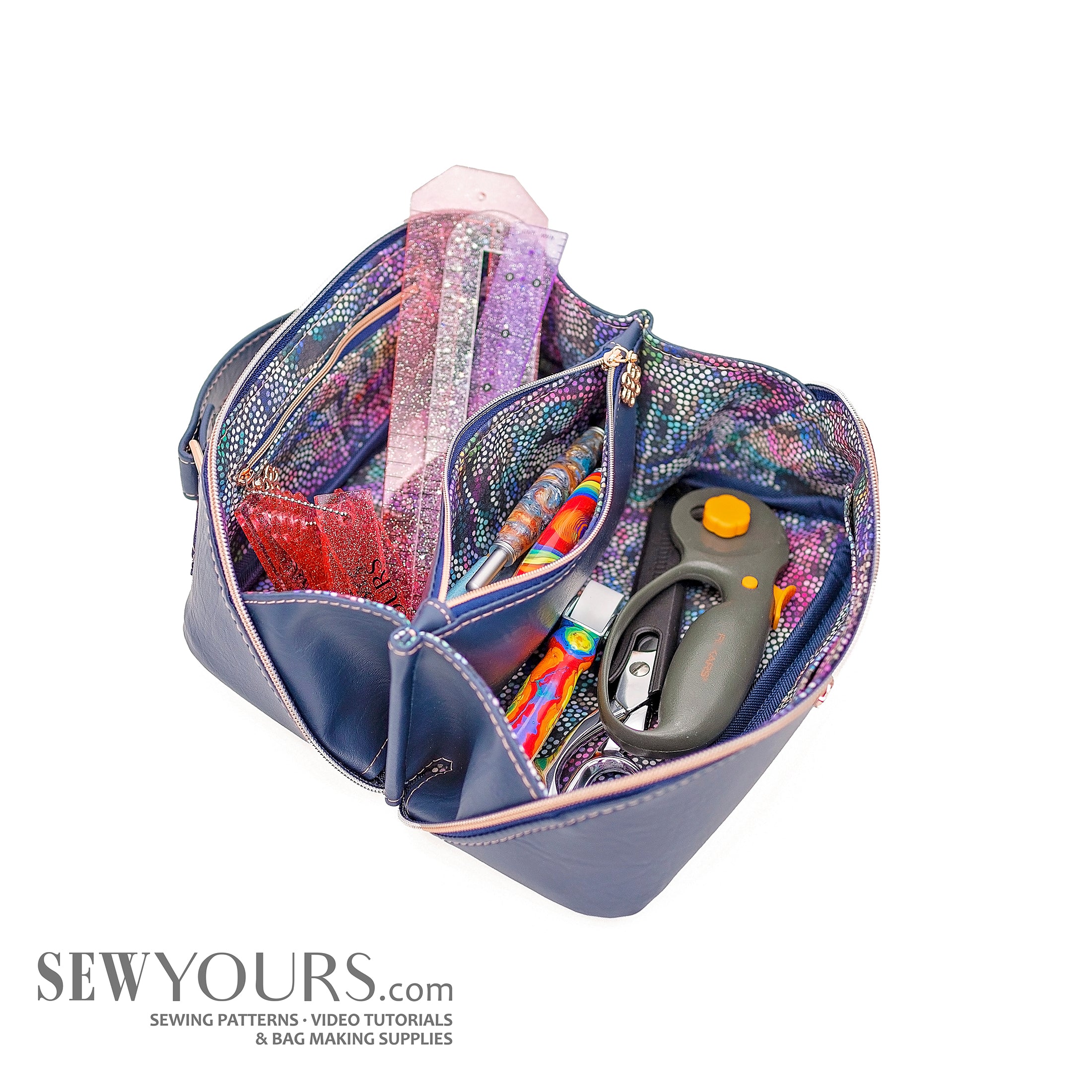 Do not reproduce, distribute, sell or share any part of this pattern. In writing, express written permission must be requested to produce and/or sell acrylic templates of any Sew Yours pattern. You can sell bags you make with Sew Yours patterns.